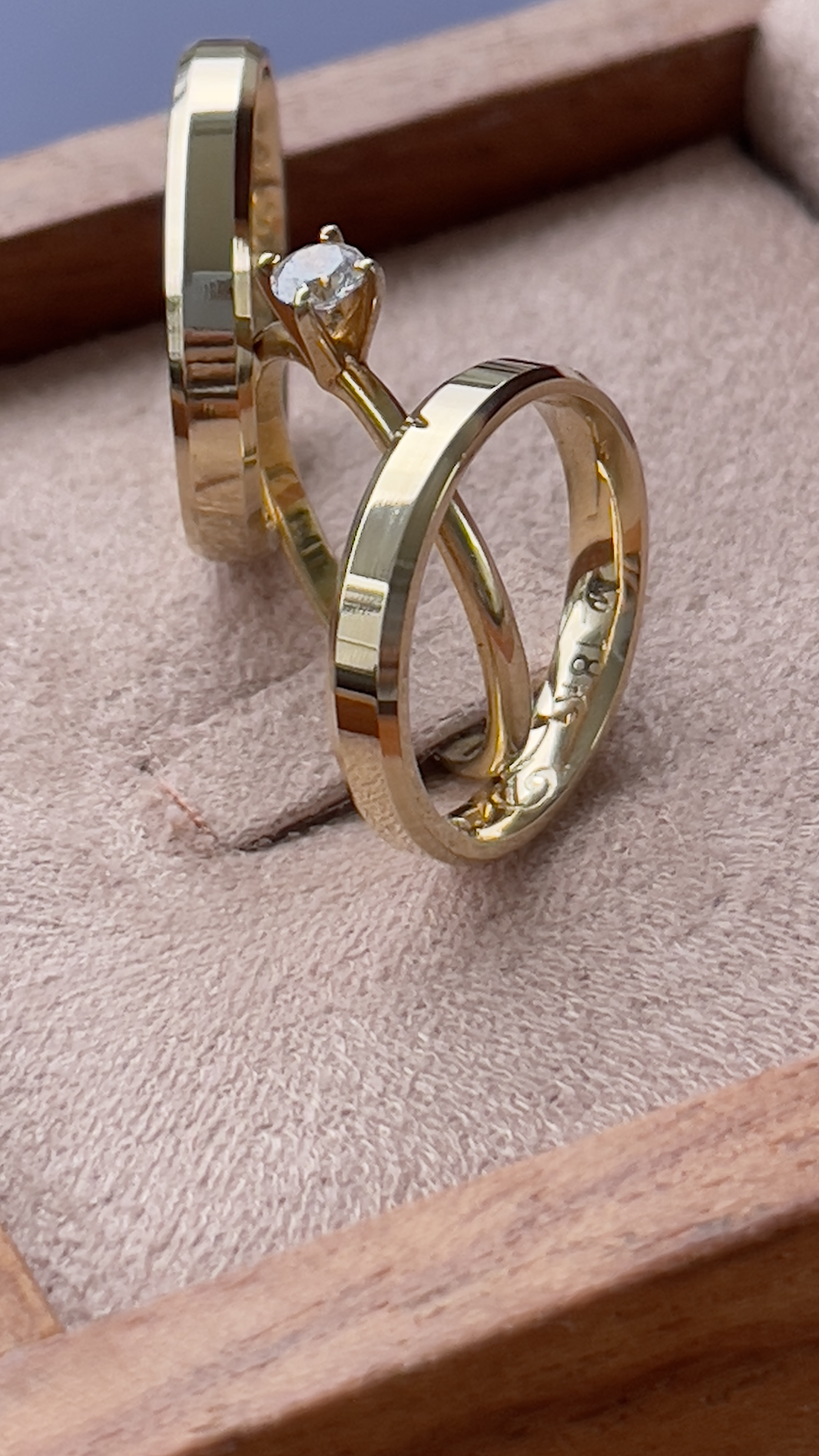 O par de alianças acompanhado do solitário Love banhado a ouro.